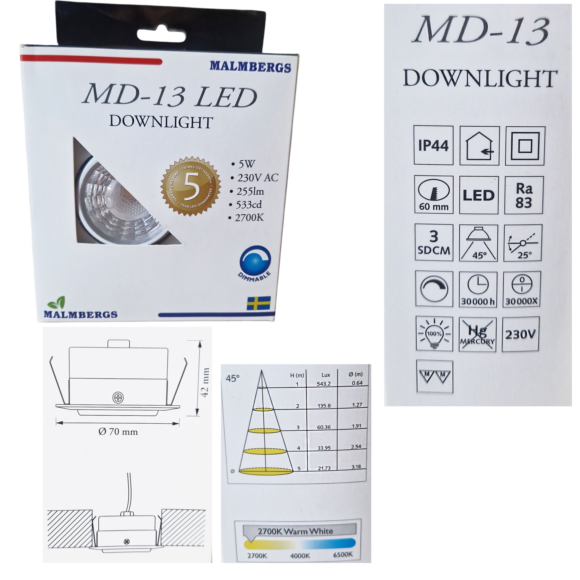 Der MD-13 LED Einbaustrahler von Malmbergs ist ein ultraflacher, dimmbarer Einzelspot mit Trafo für Bad und Feuchträume.